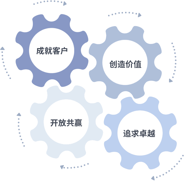 成就客户是一切决策的出发点,,创造价值是衡量所有工作的标准,,追求卓越是我们做事做人的态度,,开放共赢是我们的格局也是最终的结果。。价值观的齿轮环环相扣,,推动着组织里的每个人不断向前。。。。