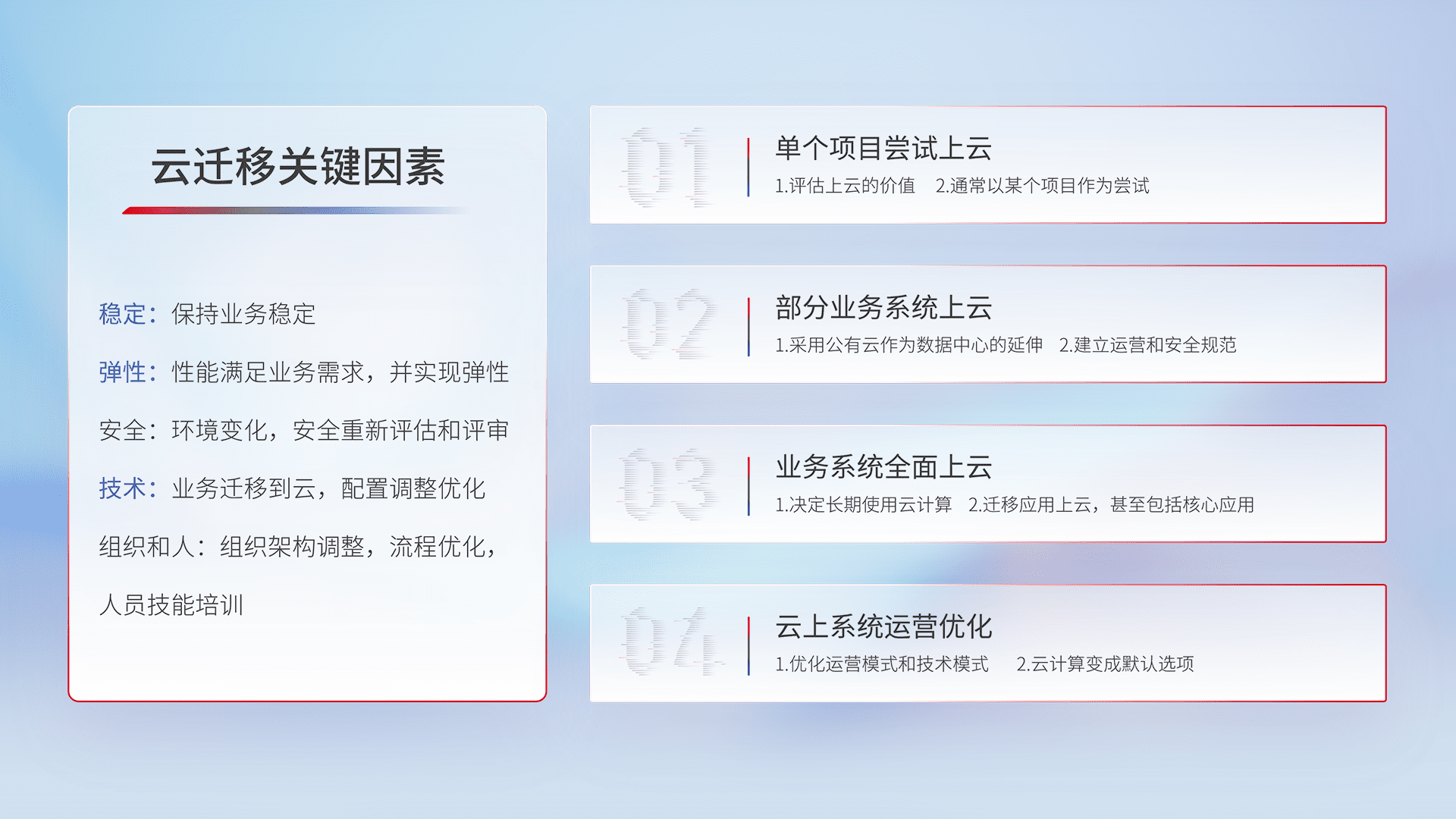 结合实际业务,,,从规划设计、、、云平台选型、、、云原生改造、、、、数据迁移、、集成交付,,,迁移全过程为客户识别最佳上云路径,,,,做好风险识别管理,,设计网络架构、、身份权限、、、、安全审计合规、、、操作审计、、、、日志审计、、、、监控告警策略、、、多站点容灾设计等,,,对云上基础设施进行整体规划,,提升IT治理水平,,以满足弹性、、高可用、、、高性能的需求。。。。