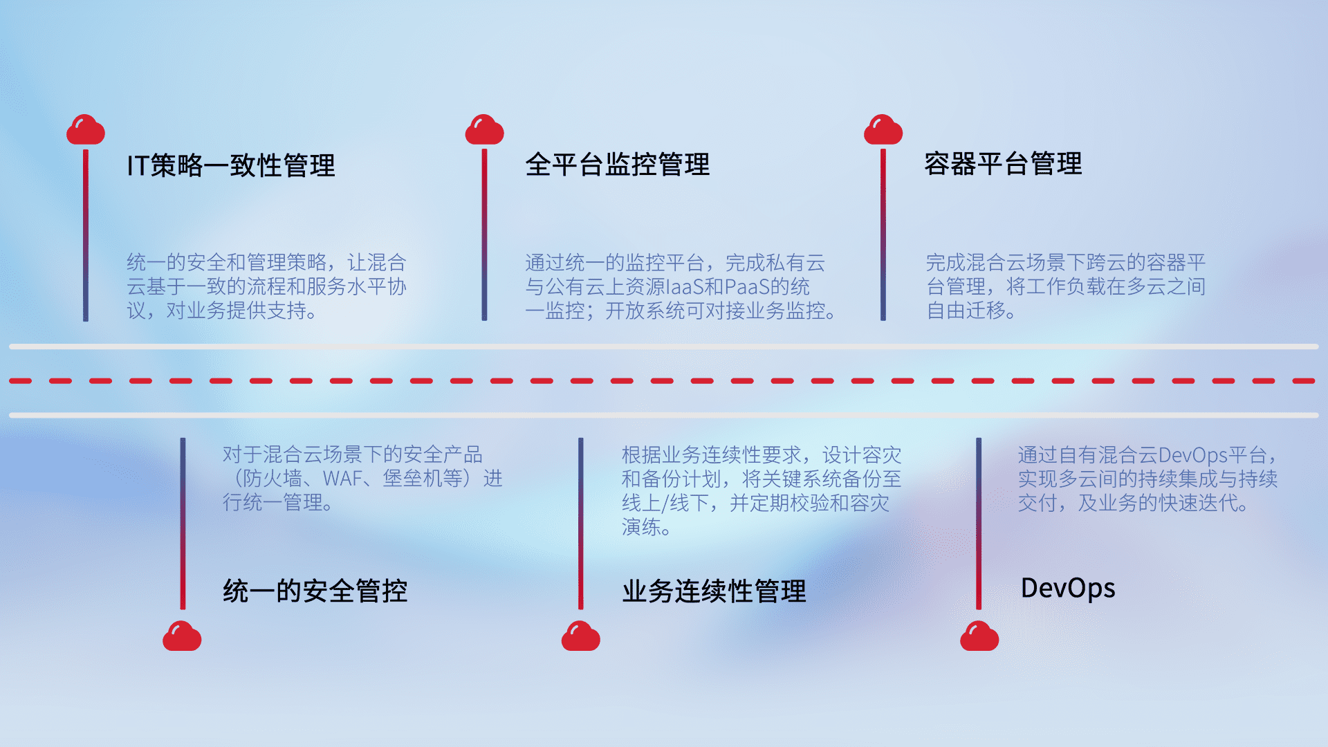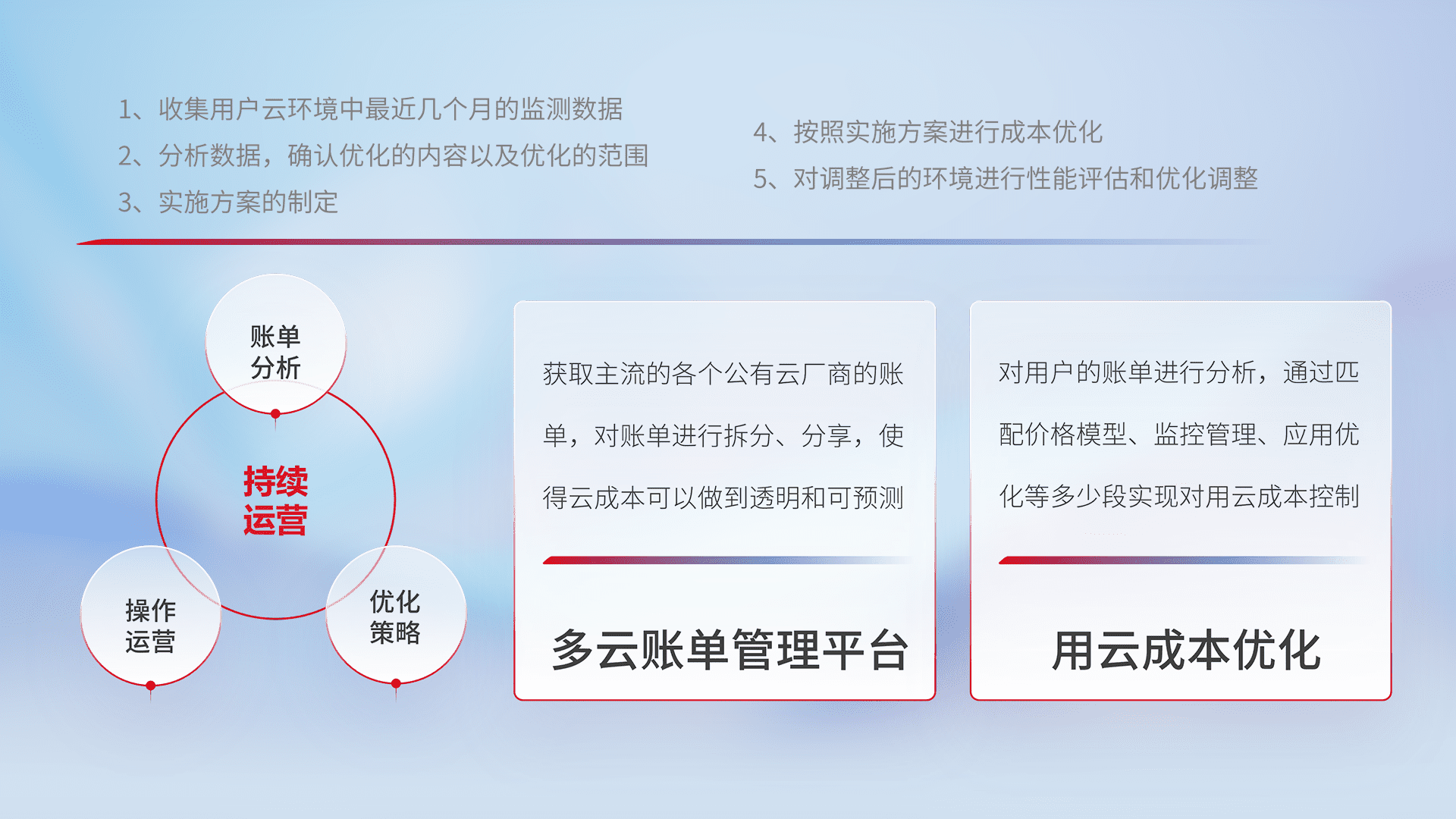 通过多云纳管,,,以统一的资源数据模型把客户的云资源进行抽象和封装,,,,进而实现对多云资源的统一操作,,,,保障云资源管理的可靠性、、稳定性与可用性。。。量身定制化运维内容,,,,配置、、开发运维、、、、补丁管理、、、备份、、、、监控、、、认证和访问管理、、、、审计和日常巡检等,,,,保障在用云过程中的可靠度,,,,稳定度以及高可用率。。。